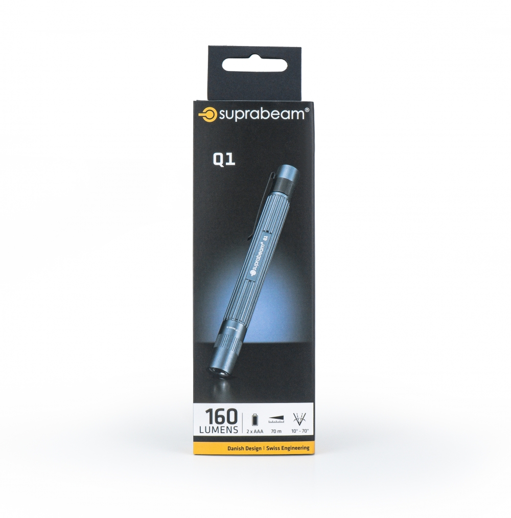 Q1 er en smart og kompakt ledlykt i penn-format med 100 lumen lysstyrke som er enkel å ha med seg. Denne smarte lykten er produsert i anodisert aluminium. Utstyrt med fokusering og et smart festeklips til skjortelommen. Lykten leveres med 2 stk AAA-batteri. Brukstemperatur: - 30 til + 50 grader celsius.