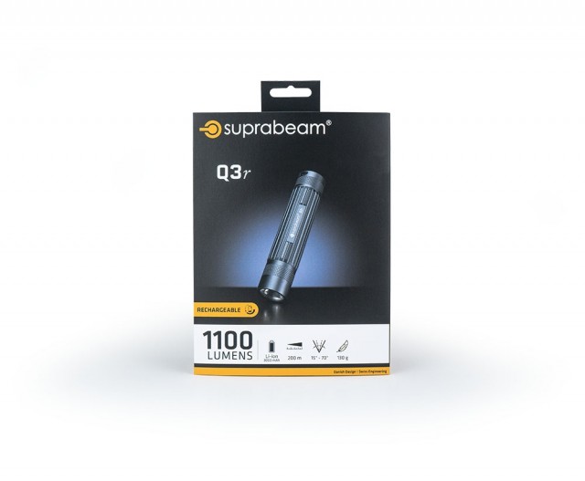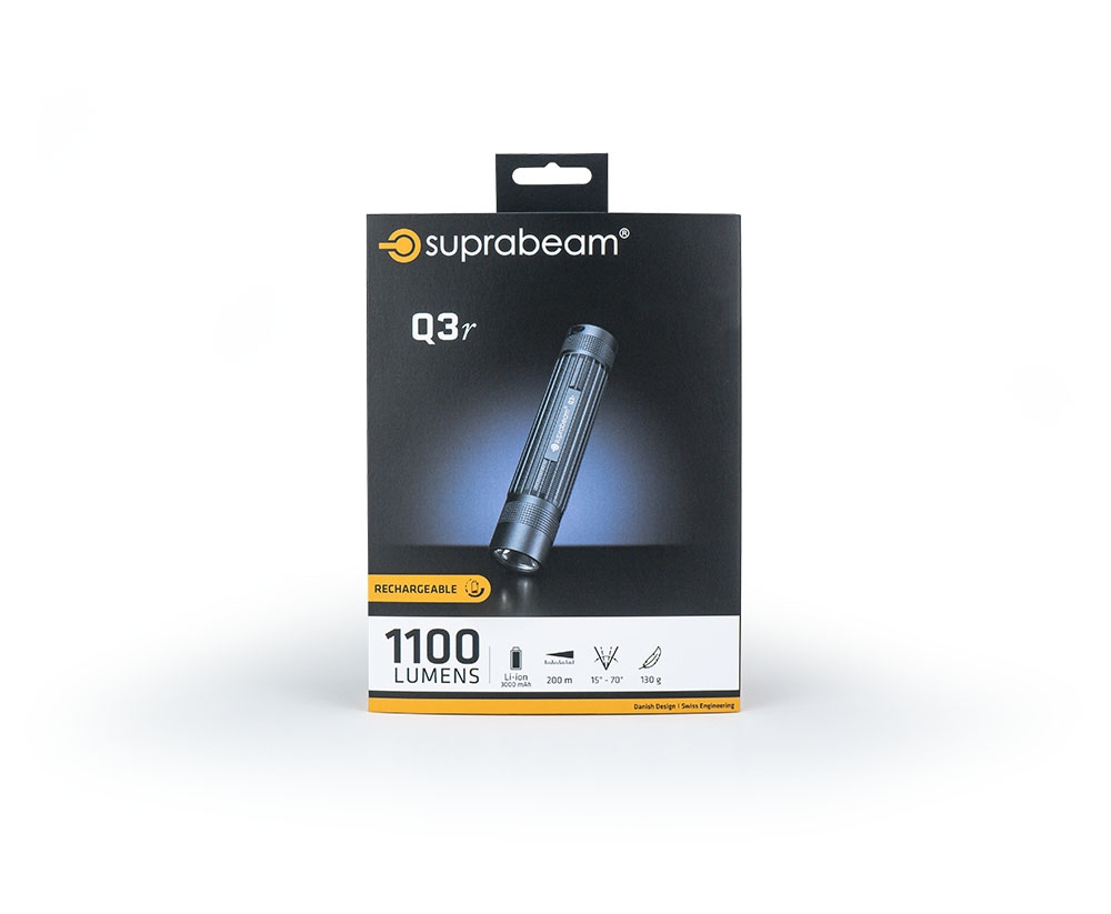 Oppladbar, superkompakt og vanntett ledlykt (IP68) med hele 1100 lumen og fokusering ! Q3r tilbyr høy ytelse, jevnt lys, kompakt størrelse og er produsert i anodisert aluminium. Veier bare 130 gram og er utstyrt med DC konverteringsteknologi som reduserer varmeutveksling i LEDen og gir mer effektiv ytelse og opp til 50% lengre varighet. Lykten har en elektronisk bryter med dimmefunksjon, som også har minne (husker det nivået man sist var på), samt boost funksjon. Q3r leveres med nytt og smart oppladbart batteri (3000 mAh) med integrert USB-ladepunkt, beltetaske, håndstropp oog USB kabel. Brukstemperatur: - 20 til + 50 grader celsius.