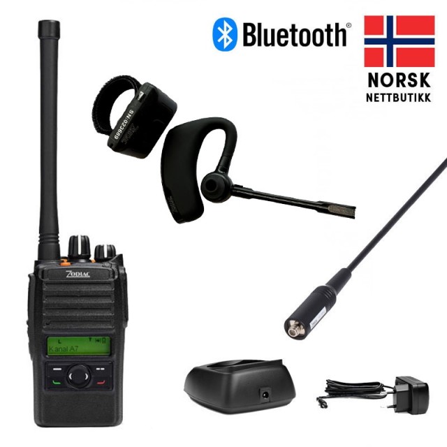 Pakken inkluderer: Radio, batteri, kort og lang antenne, bordlader, og Zodiac bluetooth PTT hodesett med PTT knapp på hodesettet/øret, samt ekstern oppladbar PTT-knapp for å feste på sekken, gevær, eller andre egnede plasser med medfølgende borrelåsbånd.