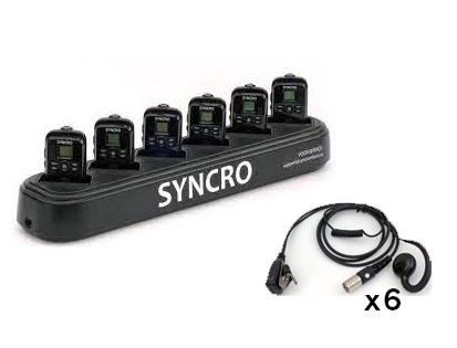 - 6 stk Syncro SV-5022 hodesett med mikrofon/PTT på ledningen og ørepropp.