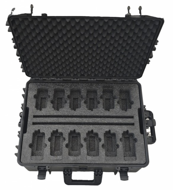 - Stor og solid oppbevaringskoffert (IP65) hvor du får plass til 12 stk. radioer og nederst i kofferten er det plass til laderack. Kofferten leveres med hjul og håndtak og 4 låser. Den passer til radioene fra Zodiac D-serien og Hytera BD/PD/HP-serien.