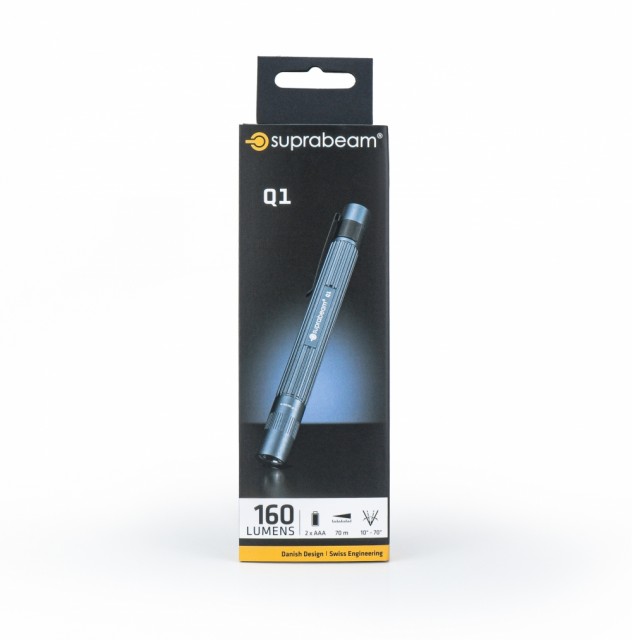 Q1 er en smart og kompakt ledlykt i penn-format med 100 lumen lysstyrke som er enkel å ha med seg. Denne smarte lykten er produsert i anodisert aluminium. Utstyrt med fokusering og et smart festeklips til skjortelommen. Lykten leveres med 2 stk AAA-batteri. Brukstemperatur: - 30 til + 50 grader celsius.